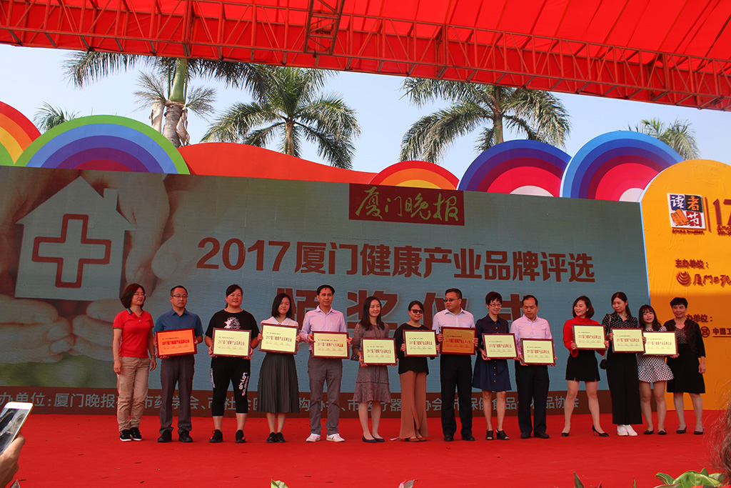 10月28日由厦门晚报社联合厦门医学会、厦门市社会医疗机构协会、 厦门市医疗器械协会、厦门市保健食品化妆品协会等举办的厦门首届健康产业知名品牌评选暨“2017厦门健康产业品牌评选”颁奖仪式在厦门日报读者节活动的白鹭洲喷泉广场举行,厦门鹰君药业被授予“2017厦门健康产业品牌企业”奖匾。