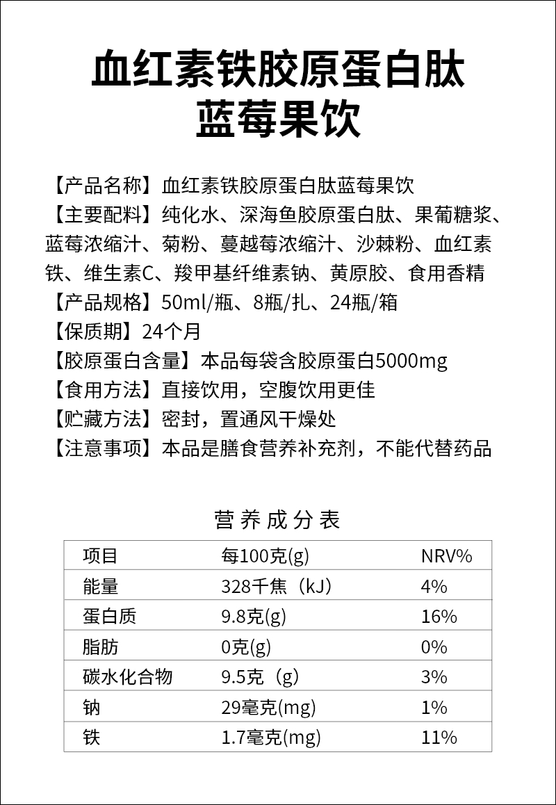 产品中心 > 胶原蛋白肽系列 > 血红素铁胶原蛋白肽蓝莓果饮